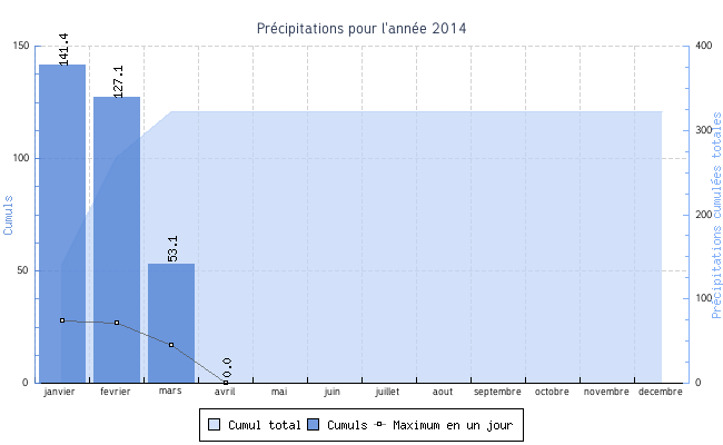 | janvier | -1.0 °C | 5.1 °C | 18.8 °C | 12.9 °C | 9.1 °C | 3.1 km/h | 28.0 km/h | S |